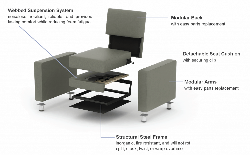 Best of all, the DURATEK construction method allows for true modularity with easy parts replacement. Each DURATEK lounge seating product allows for the feet, arms, seat cushion, and back to be attached separately. If a replacement part is required, there is no need to spend additional resources on ordering a completely new item; rather you can simply order a specific part.